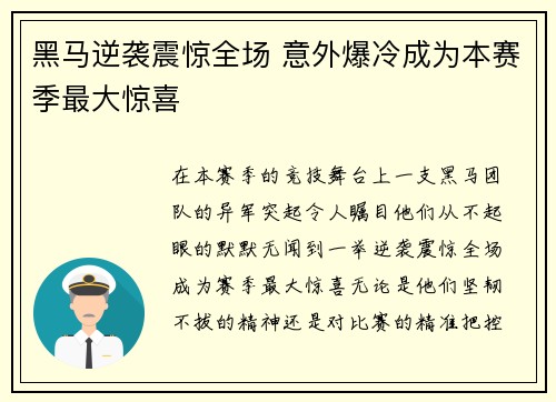 在本赛季的竞技舞台上,一支黑马团队的异军突起令人瞩目,他们从不起眼的“默默无闻”到一举逆袭震惊全场,成为赛季最大惊喜。无论是他们坚韧不拔的精神,还是对比赛的精准把控,都为他们的逆袭增添了浓厚的色彩。这...