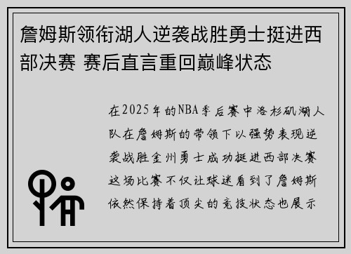 在2025年的NBA季后赛中,洛杉矶湖人队在詹姆斯的带领下以强势表现逆袭战胜金州勇士,成功挺进西部决赛。这场比赛不仅让球迷看到了詹姆斯依然保持着顶尖的竞技状态,也展示了湖人队在关键时刻的执行力和韧性。...