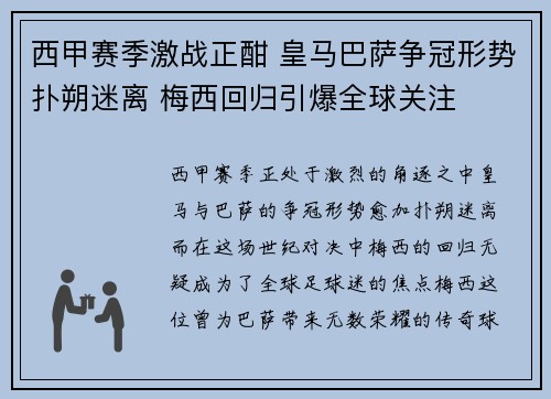 西甲赛季正处于激烈的角逐之中,皇马与巴萨的争冠形势愈加扑朔迷离。而在这场“世纪对决”中,梅西的回归无疑成为了全球足球迷的焦点。梅西,这位曾为巴萨带来无数荣耀的传奇球员,如今的重返西甲,不仅为联赛注入了...