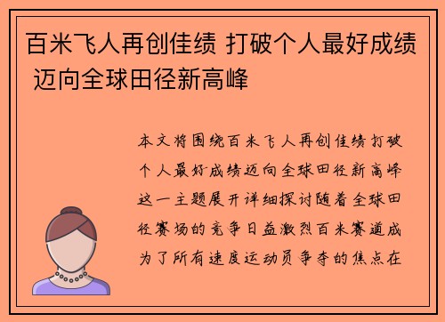 本文将围绕“百米飞人再创佳绩,打破个人最好成绩,迈向全球田径新高峰”这一主题,展开详细探讨。随着全球田径赛场的竞争日益激烈,百米赛道成为了所有速度运动员争夺的焦点。在这个充满挑战的舞台上,百米飞人通过...