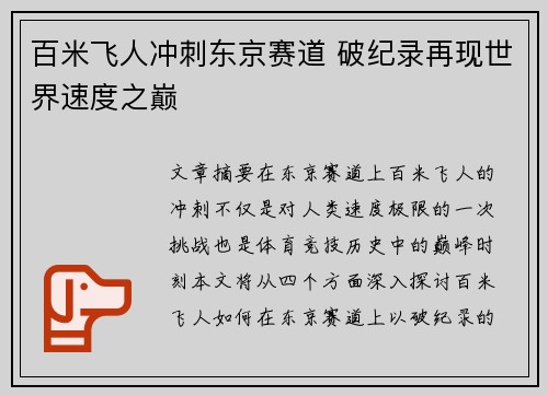 文章摘要:在东京赛道上,百米飞人的冲刺不仅是对人类速度极限的一次挑战,也是体育竞技历史中的巅峰时刻。本文将从四个方面深入探讨百米飞人如何在东京赛道上以破纪录的速度再现世界之巅。首先,我们将回顾百米跑的...
