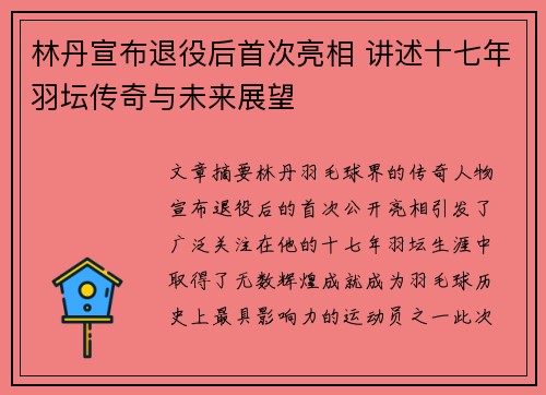 文章摘要:林丹,羽毛球界的传奇人物,宣布退役后的首次公开亮相引发了广泛关注。在他的十七年羽坛生涯中,取得了无数辉煌成就,成为羽毛球历史上最具影响力的运动员之一。此次亮相,他不仅回顾了自己从一名少年运动...