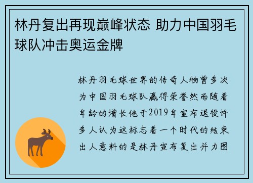 林丹,羽毛球世界的传奇人物,曾多次为中国羽毛球队赢得荣誉。然而,随着年龄的增长,他于2019年宣布退役,许多人认为这标志着一个时代的结束。出人意料的是,林丹宣布复出,并力图再现巅峰状态,助力中国羽毛球...