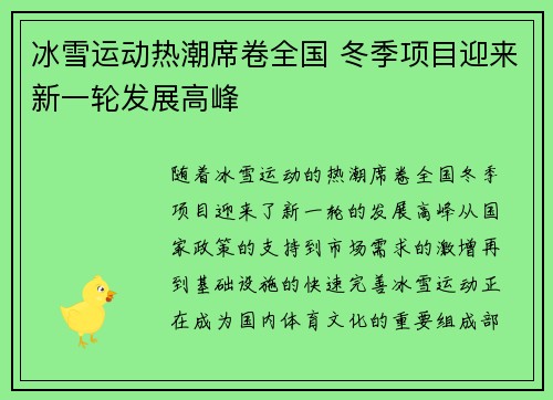 随着冰雪运动的热潮席卷全国,冬季项目迎来了新一轮的发展高峰。从国家政策的支持,到市场需求的激增,再到基础设施的快速完善,冰雪运动正在成为国内体育文化的重要组成部分。本文将从多个方面详细分析冰雪运动在中...