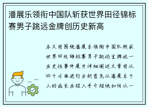 本文将围绕潘展乐领衔中国队斩获世界田径锦标赛男子跳远金牌这一历史性事件展开详细阐述。文章将从四个方面进行分析,首先从潘展乐个人的成长历程入手,介绍他如何从一名普通运动员成长为世界级选手;接着讨论中国男...