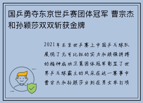 2021年东京世乒赛上,中国乒乓球队展现了无可比拟的实力和顽强拼搏的精神,成功卫冕团体冠军,彰显了世界乒乓球霸主的风采。在这一赛事中,曹宗杰和孙颖莎分别在男女单打项目中大放异彩,斩获金牌,为国乒增光添...
