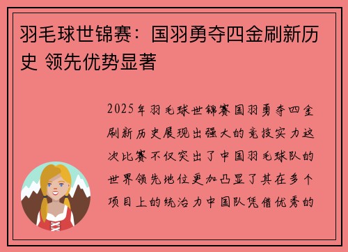 2025年羽毛球世锦赛,国羽勇夺四金,刷新历史,展现出强大的竞技实力。这次比赛不仅突出了中国羽毛球队的世界领先地位,更加凸显了其在多个项目上的统治力。中国队凭借优秀的选手表现,成功在男单、女单、男双和...