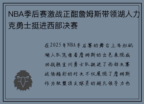 在2025年NBA季后赛的舞台上,洛杉矶湖人队凭借着詹姆斯的出色表现,成功战胜金州勇士队,挺进了西部决赛。这场精彩的对决不仅展现了詹姆斯作为联盟顶尖球员的超凡领导力,也体现了湖人队在季后赛中的强大韧性...