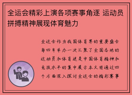 全运会作为我国体育界的重要盛会,每四年举办一次,汇聚了全国各地的运动员和体育迷,是中国体育精神和竞技水平的集中展示。本文将通过四个方面深入探讨全运会的精彩赛事,及其所展现出的运动员拼搏精神和体育魅力。...