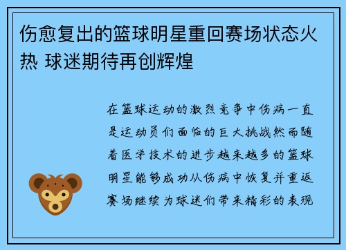 在篮球运动的激烈竞争中,伤病一直是运动员们面临的巨大挑战。然而,随着医学技术的进步,越来越多的篮球明星能够成功从伤病中恢复,并重返赛场,继续为球迷们带来精彩的表现。这些伤愈复出的明星球员不仅克服了身体...