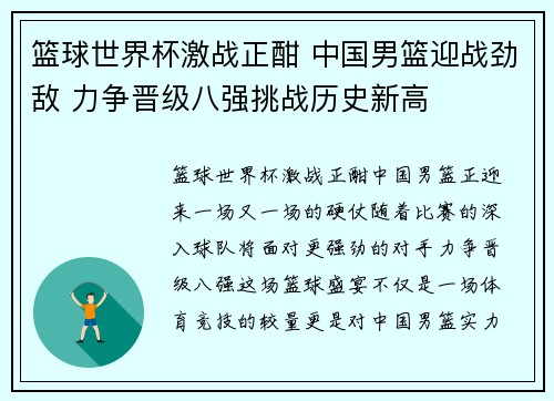 篮球世界杯激战正酣,中国男篮正迎来一场又一场的硬仗。随着比赛的深入,球队将面对更强劲的对手,力争晋级八强。这场篮球盛宴不仅是一场体育竞技的较量,更是对中国男篮实力的全面检验。本篇文章将从四个方面详细探...