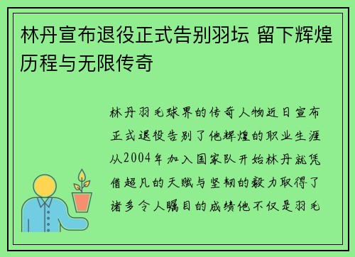林丹,羽毛球界的传奇人物,近日宣布正式退役,告别了他辉煌的职业生涯。从2004年加入国家队开始,林丹就凭借超凡的天赋与坚韧的毅力,取得了诸多令人瞩目的成绩。他不仅是羽毛球历史上最为杰出的男子单打选手之...