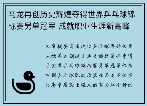 文章摘要:马龙,这位乒乓球界的传奇人物,再次创造了历史的新高峰——夺得了世界乒乓球锦标赛男单冠军。作为中国乒乓球队的顶梁柱,马龙不仅在比赛中展现出强大的实力和冷静的心态,更凭借丰富的经验和精湛的技术,...