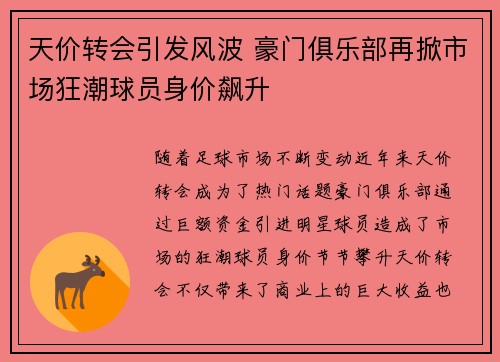 随着足球市场不断变动,近年来天价转会成为了热门话题。豪门俱乐部通过巨额资金引进明星球员,造成了市场的狂潮,球员身价节节攀升。天价转会不仅带来了商业上的巨大收益,也引发了诸多争议和风波。无论是球队的引援...