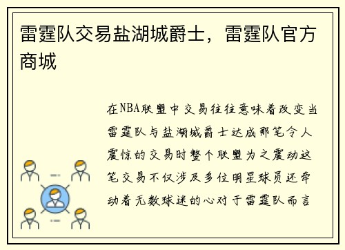 在NBA联盟中,交易往往意味着改变。当雷霆队与盐湖城爵士达成那笔令人震惊的交易时,整个联盟为之震动。这笔交易不仅涉及多位明星球员,还牵动着无数球迷的心。对于雷霆队而言,这是一次大胆的重组,而对于盐湖城...