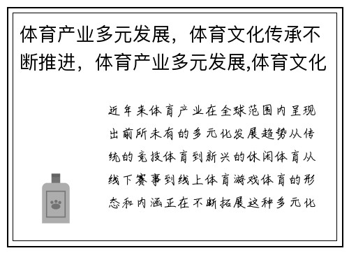近年来,体育产业在全球范围内呈现出前所未有的多元化发展趋势。从传统的竞技体育到新兴的休闲体育,从线下赛事到线上体育游戏,体育的形态和内涵正在不断拓展。这种多元化不仅满足了人们对健康生活的追求,也为社会...