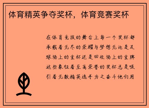 在体育竞技的舞台上,每一个奖杯都承载着无尽的荣耀与梦想。无论是足球场上的金杯,还是田径场上的金牌,这些象征着至高荣誉的奖杯,总是吸引着无数精英选手为之奋斗。他们用汗水、智慧和坚持,在无数次的训练和比赛...