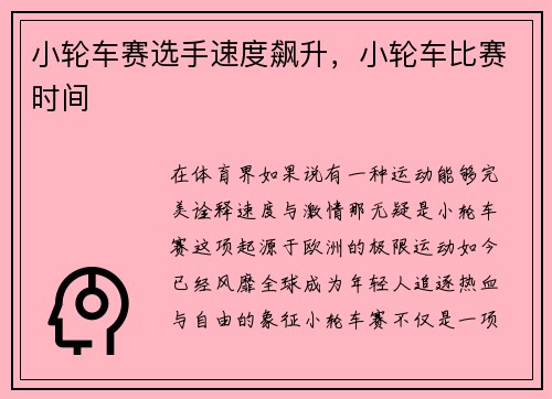 在体育界,如果说有一种运动能够完美诠释“速度与激情”,那无疑是小轮车赛。这项起源于欧洲的极限运动,如今已经风靡全球,成为年轻人追逐热血与自由的象征。小轮车赛不仅是一项需要精湛技巧的运动,更是一场速度与...