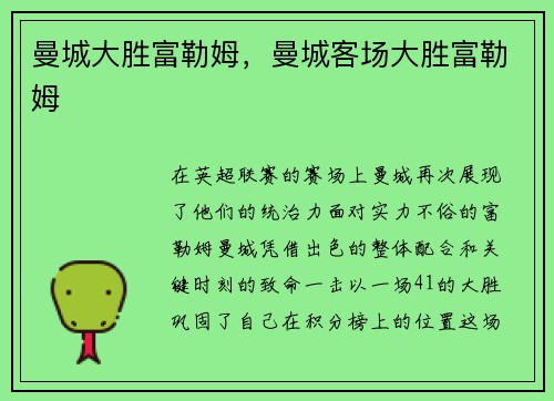 在英超联赛的赛场上,曼城再次展现了他们的统治力。面对实力不俗的富勒姆,曼城凭借出色的整体配合和关键时刻的致命一击,以一场4-1的大胜巩固了自己在积分榜上的位置。这场比赛不仅让曼城球迷欢呼雀跃,也让整个...