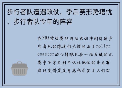 在NBA常规赛即将结束的冲刺阶段,步行者队的球迷们无疑经历了rollercoaster的心情。球队在一场关键的比赛中不幸失利,不仅让他们的季后赛席位变得岌岌可危,也引发了人们对这支球队未来发展的广泛讨...