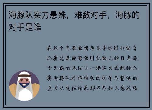在这个充满激情与竞争的时代,体育比赛总是能够吸引无数人的目光。而今天,我们见证了一场实力悬殊的比赛,海豚队对阵强劲的对手,尽管他们全力以赴,但结果却不尽如人意。这场比赛不仅让人感叹竞技体育的残酷,也让...