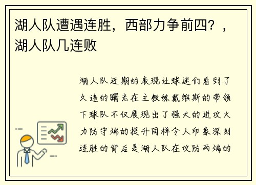 湖人队近期的表现让球迷们看到了久违的曙光。在主教练戴维斯的带领下,球队不仅展现出了强大的进攻火力,防守端的提升同样令人印象深刻。连胜的背后,是湖人队在攻防两端的全面调整,以及球员们状态的集体回暖。 勒...