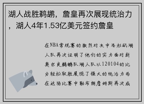 在NBA常规赛的激烈对决中,洛杉矶湖人队再次证明了他们的实力。面对新奥尔良鹈鹕队,湖人队以120:104的比分轻松取胜,展现了强大的统治力。而在这场比赛中,勒布朗·詹姆斯再次成为了全场焦点,他的表现不...