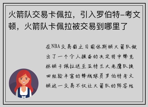 在NBA交易截止日前,休斯顿火箭队做出了一个令人振奋的决定:将中锋克林顿·卡佩拉送至亚特兰大老鹰队,换回经验丰富的锋线球员罗伯特-考文顿。这一交易不仅让火箭队的阵容结构发生了变化,更是球队管理层对未来...