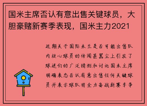 近期,关于国际米兰是否可能出售队内核心球员的传闻甚嚣尘上,引发了球迷们的广泛猜测和讨论。国米主席明确表态,否认有意出售任何关键球员,并表示球队将全力备战新赛季,争取在各项赛事中取得优异成绩。这一决定无...