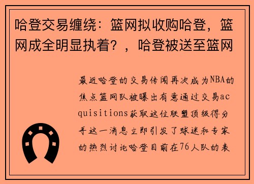 最近,哈登的交易传闻再次成为NBA的焦点。篮网队被曝出有意通过交易acquisitions获取这位联盟顶级得分手,这一消息立即引发了球迷和专家的热烈讨论。哈登目前在76人队的表现并不如人意,外界普遍认...