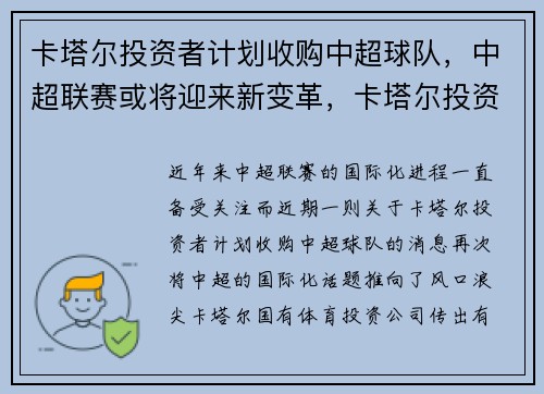 近年来,中超联赛的国际化进程一直备受关注。而近期,一则关于卡塔尔投资者计划收购中超球队的消息,再次将中超的国际化话题推向了风口浪尖。卡塔尔国有体育投资公司传出有意收购中超球队的消息,这不仅意味着中超联...