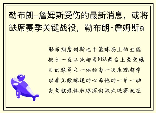 勒布朗-詹姆斯,这个篮球场上的全能战士,一直以来都是NBA舞台上最受瞩目的球员之一。他的每一次表现都牵动着无数球迷的心,而他的一举一动更是被媒体和球探们放大观察。就在本赛季即将进入最关键阶段时,一个令...