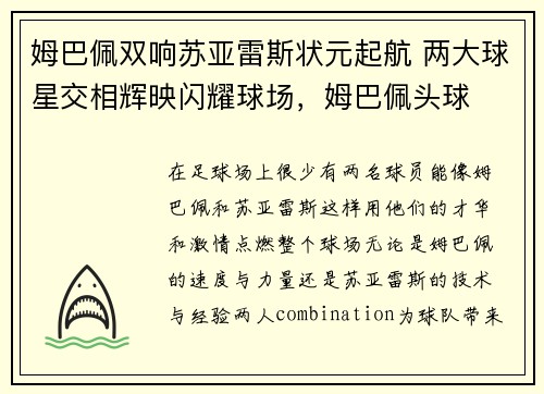 在足球场上,很少有两名球员能像姆巴佩和苏亚雷斯这样,用他们的才华和激情点燃整个球场。无论是姆巴佩的速度与力量,还是苏亚雷斯的技术与经验,两人combination为球队带来了无尽的可能。这场比赛,姆巴...