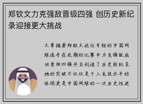 文章摘要:郑钦文,这位年轻的中国网球选手,在近期的比赛中力克强敌,成功晋级四强,并且创造了历史新纪录。她的突破不仅仅是个人竞技水平的体现,更是中国网球的一次历史性进步。本文将从郑钦文的个人实力、技术进...