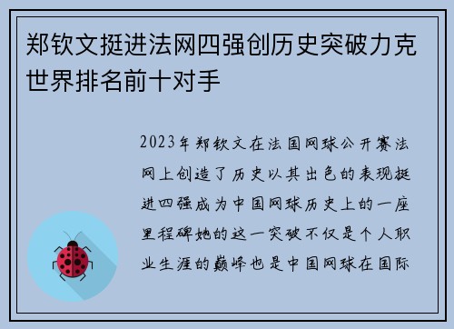 2023年,郑钦文在法国网球公开赛(法网)上创造了历史,以其出色的表现挺进四强,成为中国网球历史上的一座里程碑。她的这一突破,不仅是个人职业生涯的巅峰,也是中国网球在国际大赛上的又一突破性进展。郑钦文...