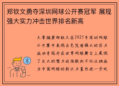 文章摘要:郑钦文在2025年深圳网球公开赛中表现出色,凭借强大的实力成功夺冠,并在世界网球舞台上展现了巨大的潜力。这场胜利不仅让她成为中国网球的新兴力量,也进一步巩固了她在世界网球排名中的位置。郑钦文...