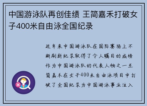 近年来,中国游泳队在国际赛场上不断刷新纪录,取得了令人瞩目的成绩。作为中国游泳队的代表人物之一,王简嘉禾在女子400米自由泳项目中打破了全国纪录,为中国游泳事业注入了新的活力。这一突破不仅展示了王简嘉...